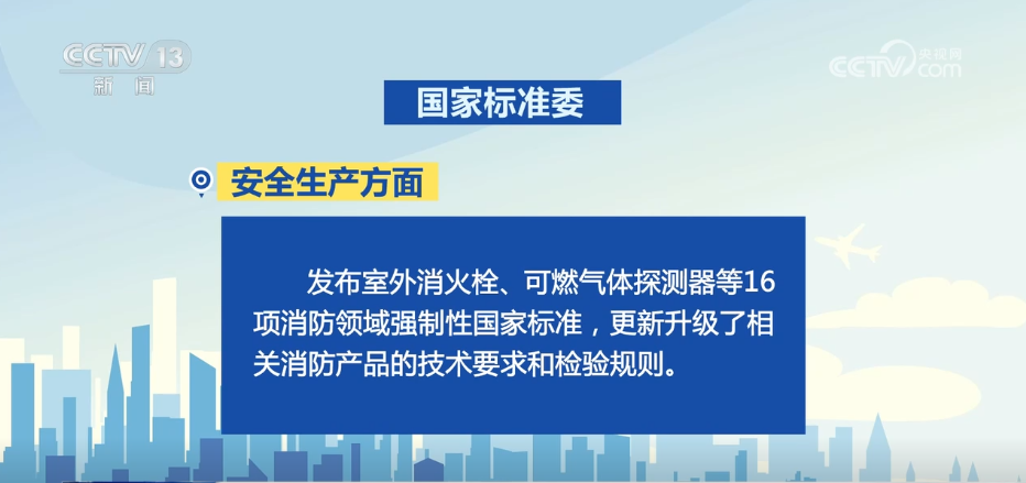 在安全生產方面,發布室外消火栓、可燃氣體探測器等16項消防領域強制性國家標準,更新升級了相關消防產品的技術要求和檢驗規則。