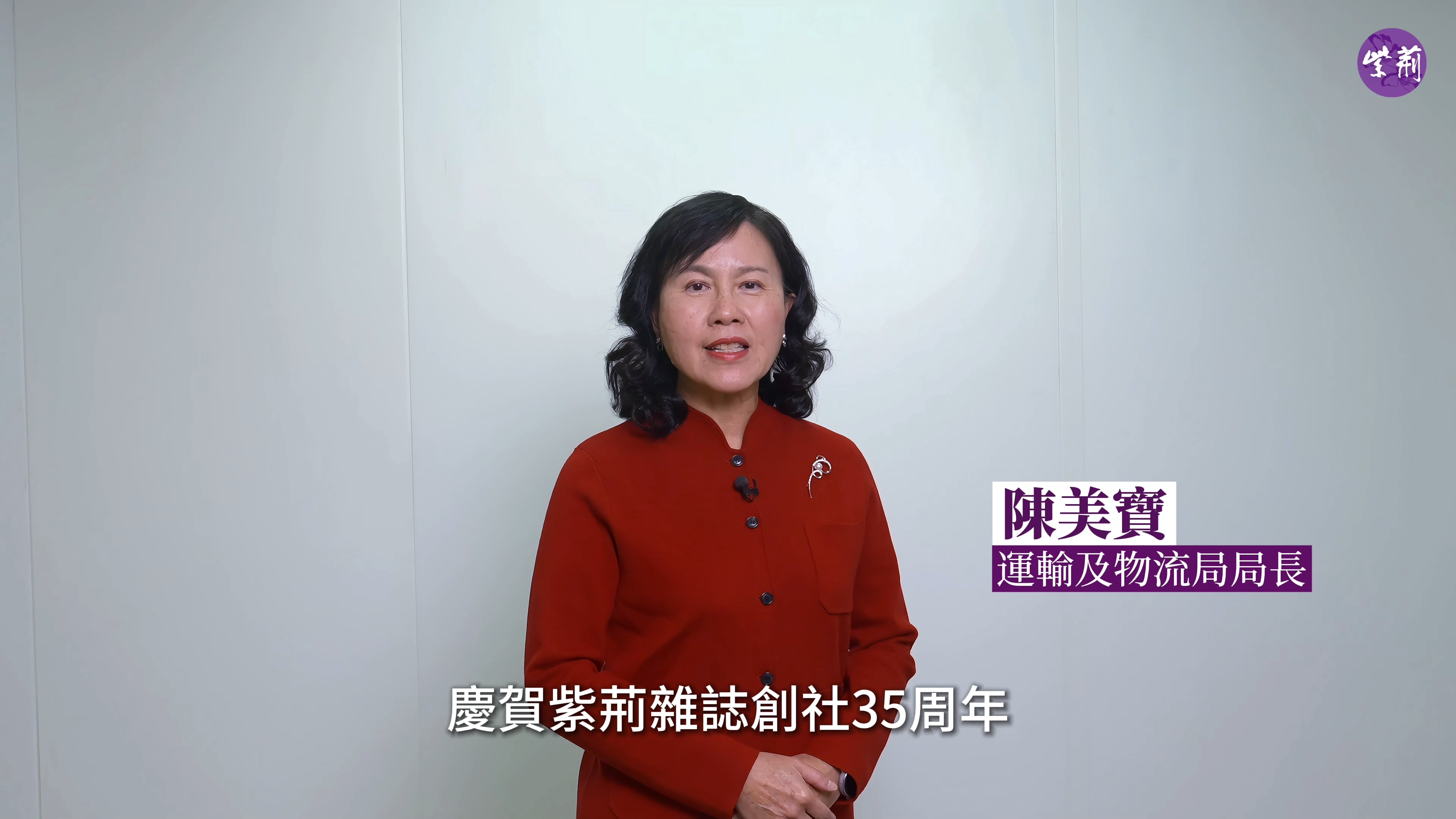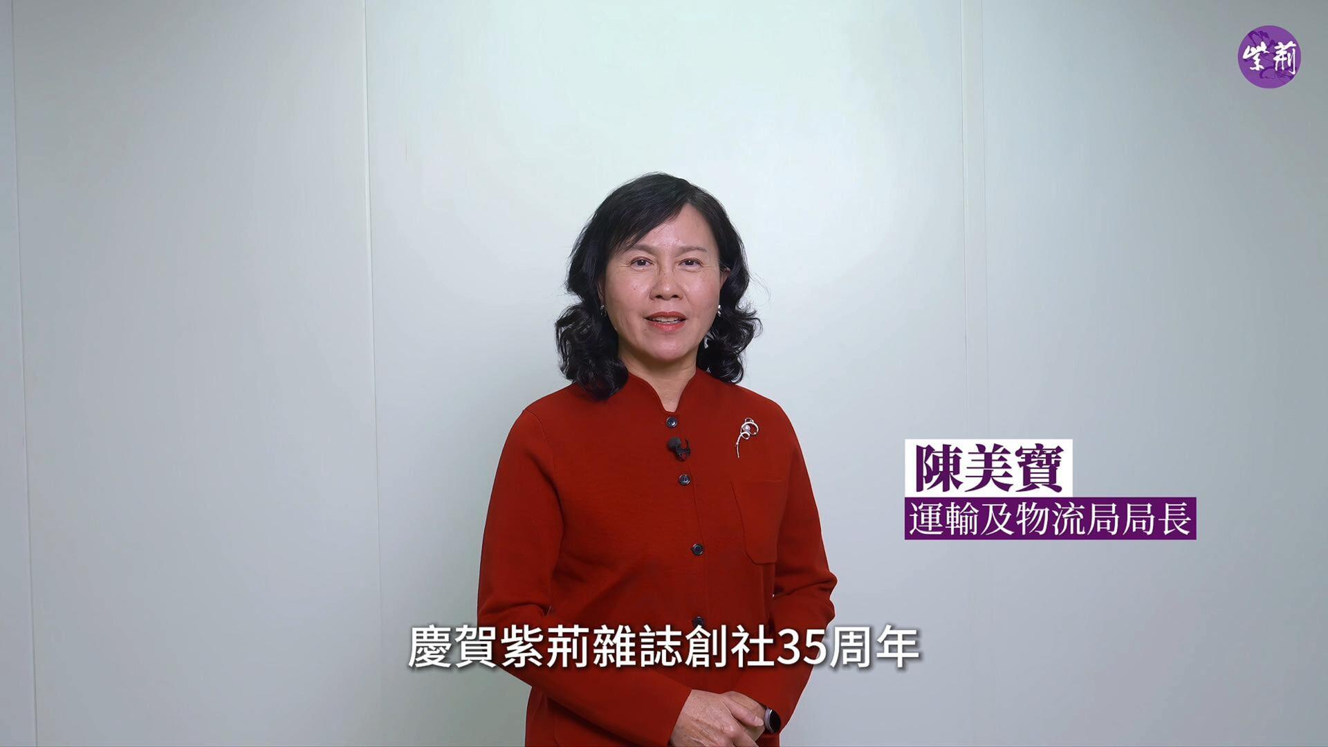 在紫荊雜誌社成立35年之際,香港特區政府運輸及物流局局長陳美寶為雜誌社送上祝福,她慶賀紫荊雜誌創社35周年,這35年見證香港國際航運航空和物流樞紐崛起,助力運輸發展,聯通世界商機。祝願紫荊雜誌繼續為香港運輸物流事業騰飛增添動力。