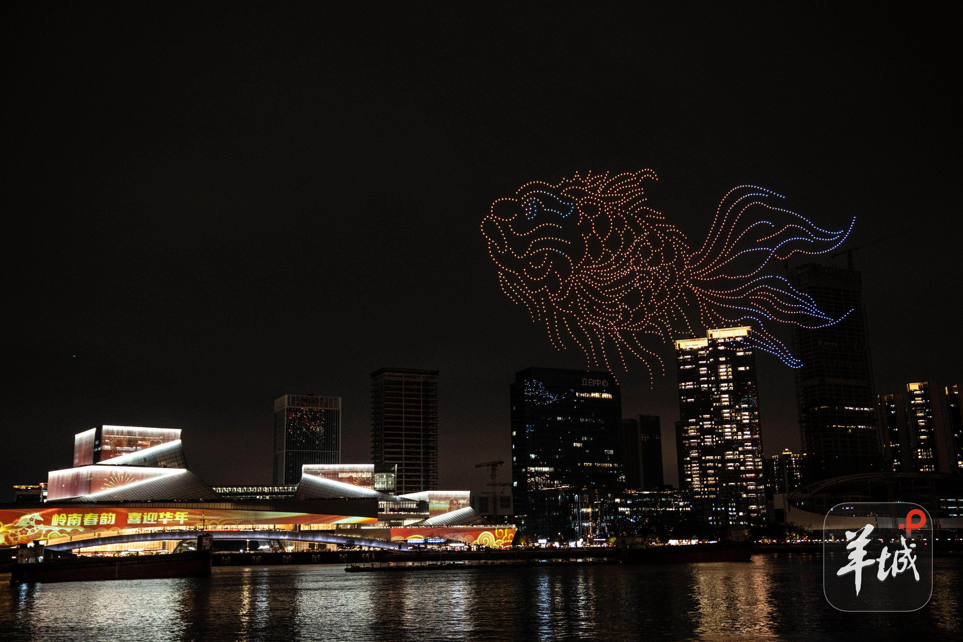 煙花匯演開篇的無人機表演,呈現出鰲魚圖案。