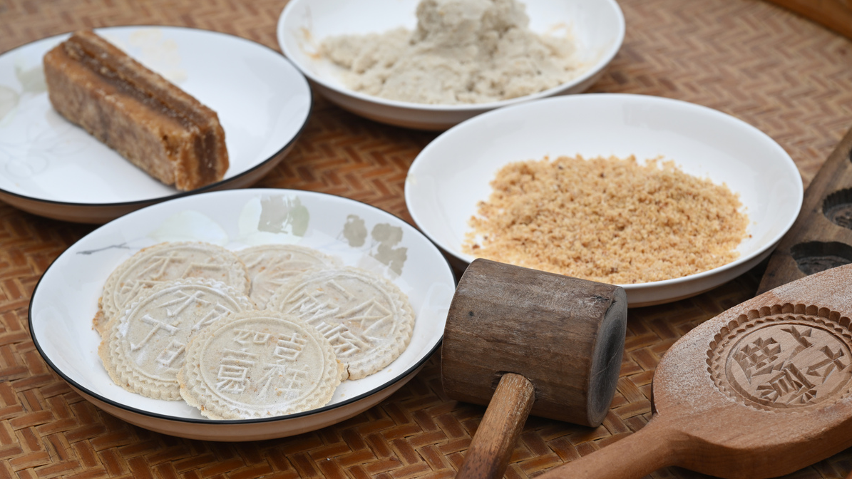 此起彼落的“揼餅”聲,在上水圍的寧靜街巷中迴盪。循聲而至,原來法定古蹟廖萬石堂後方的工場內,一群圍村婦女正圍着長木桌,馬不停蹄地製作炒米餅。
