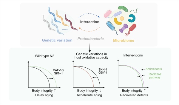 團隊通過研究缺失關鍵衰老調節因子的線蟲突變體,發現微生物對壽命的調控表現出極強的遺傳背景依賴性。部分在野生型線蟲中表現為“益生菌”的變形菌門菌株,在氧化應激轉錄因子skn-1缺失的突變體中卻變成了致命的“殺手”,它不僅顯著縮短了線蟲的壽命,還造成了機體屏障功能的嚴重受損。