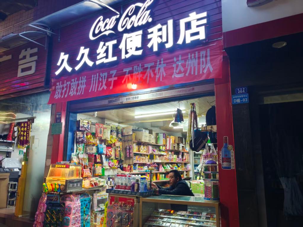 距離體育場不遠的久久紅便利店門口,掛着“敢打敢拼川漢子,不勝不休達州隊”的標語。老闆李先生笑着說,當晚生意“馬馬虎虎”“也就賣了四五千”,而平時這個時候,大約只有兩千多。