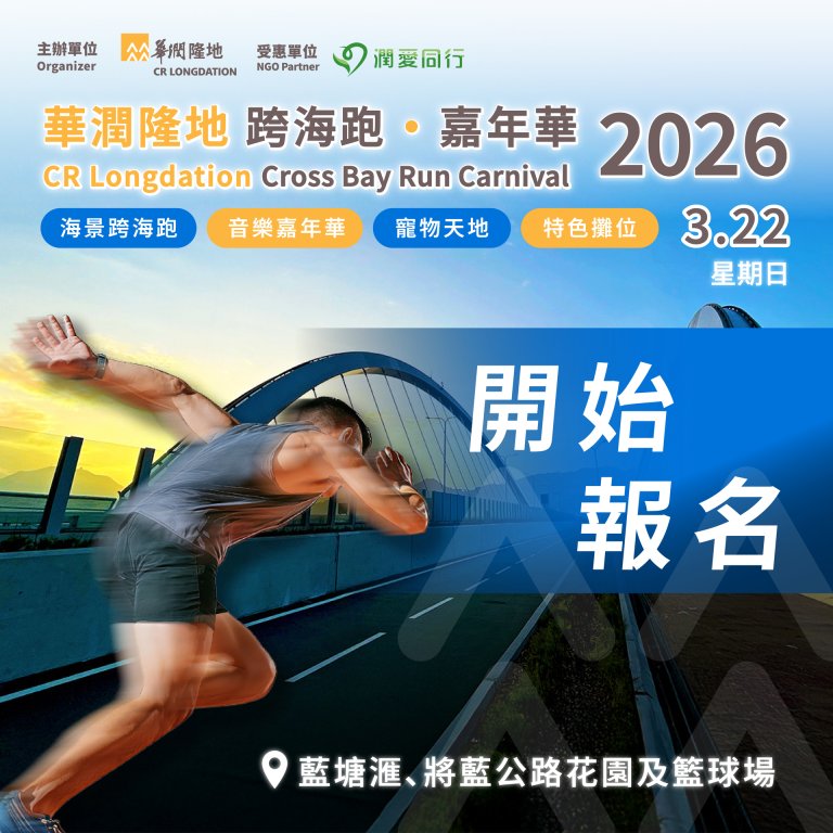 2026年3月22日,華潤隆地跨海跑‧嘉年華 2026 即將盛大舉行!活動同時結合慈善元素,扣除必要的行政費用後,所籌得的善款將撥捐予“潤愛同行”,與其挽手支持社區活動。