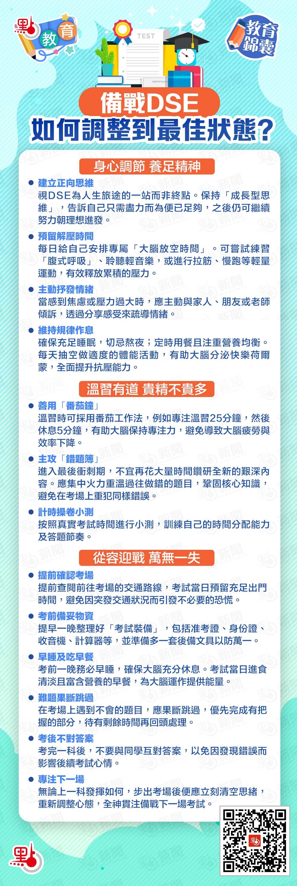 2026年香港中學文憑試英文口試已於本周二(10日)開考,筆試則於4月8日開啟。面對DSE,考生難免感到緊張不安,但良好的心態往往是保證發揮的關鍵。“點教育”特意整理備戰DSE貼士懶人包,助各位考生調整步伐,以最佳的身心狀態迎接挑戰!