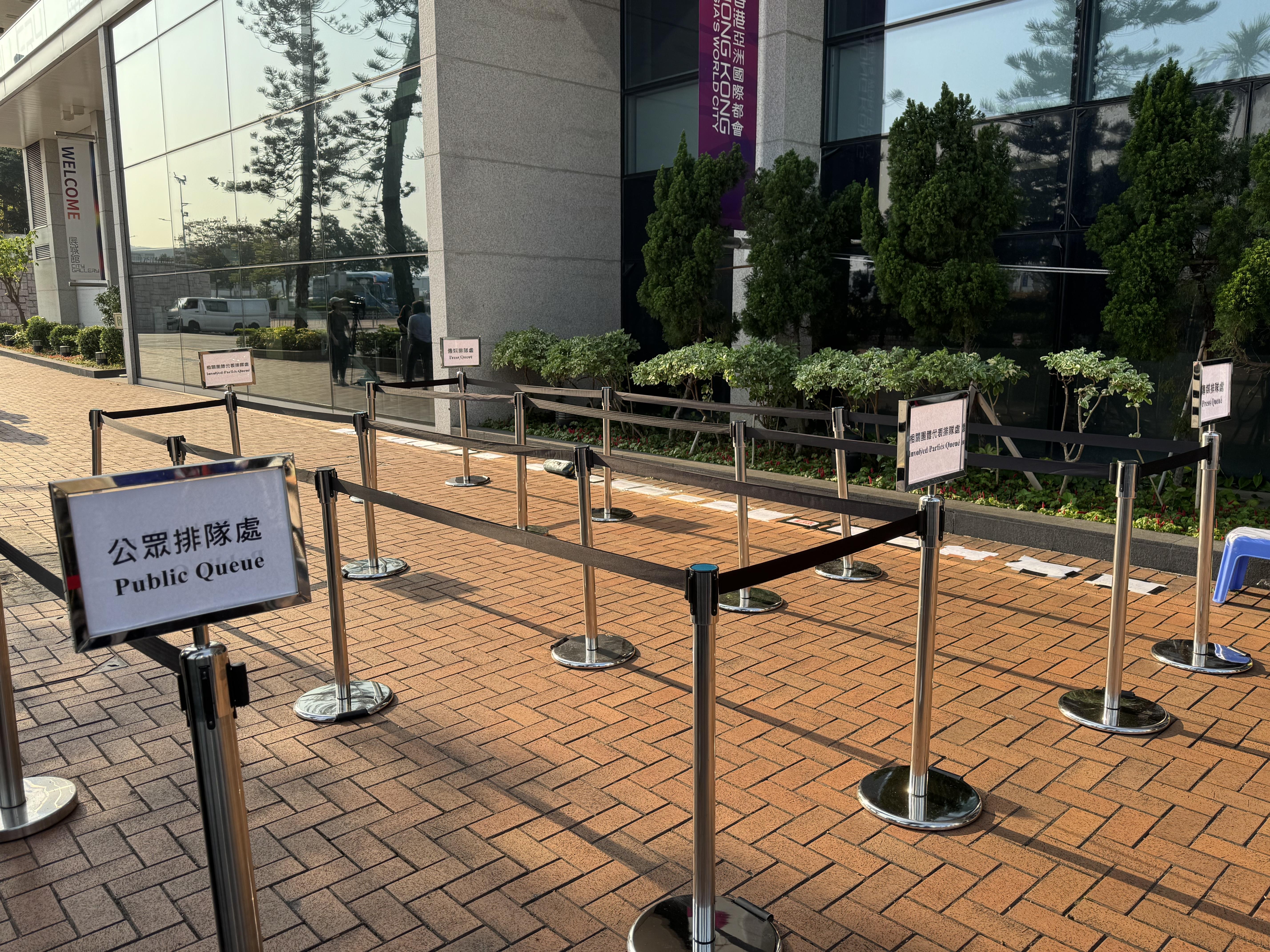 8時50分左右,現場已有宏福苑居民到場。聽證會向公眾開放,現場設有公眾排隊處、相關團體代表排隊處及媒體排隊處。聽證會將預留部分座位予涉事方,並會開放名額予公眾人士旁聽,當中約一半會優先分配予宏福苑居民。