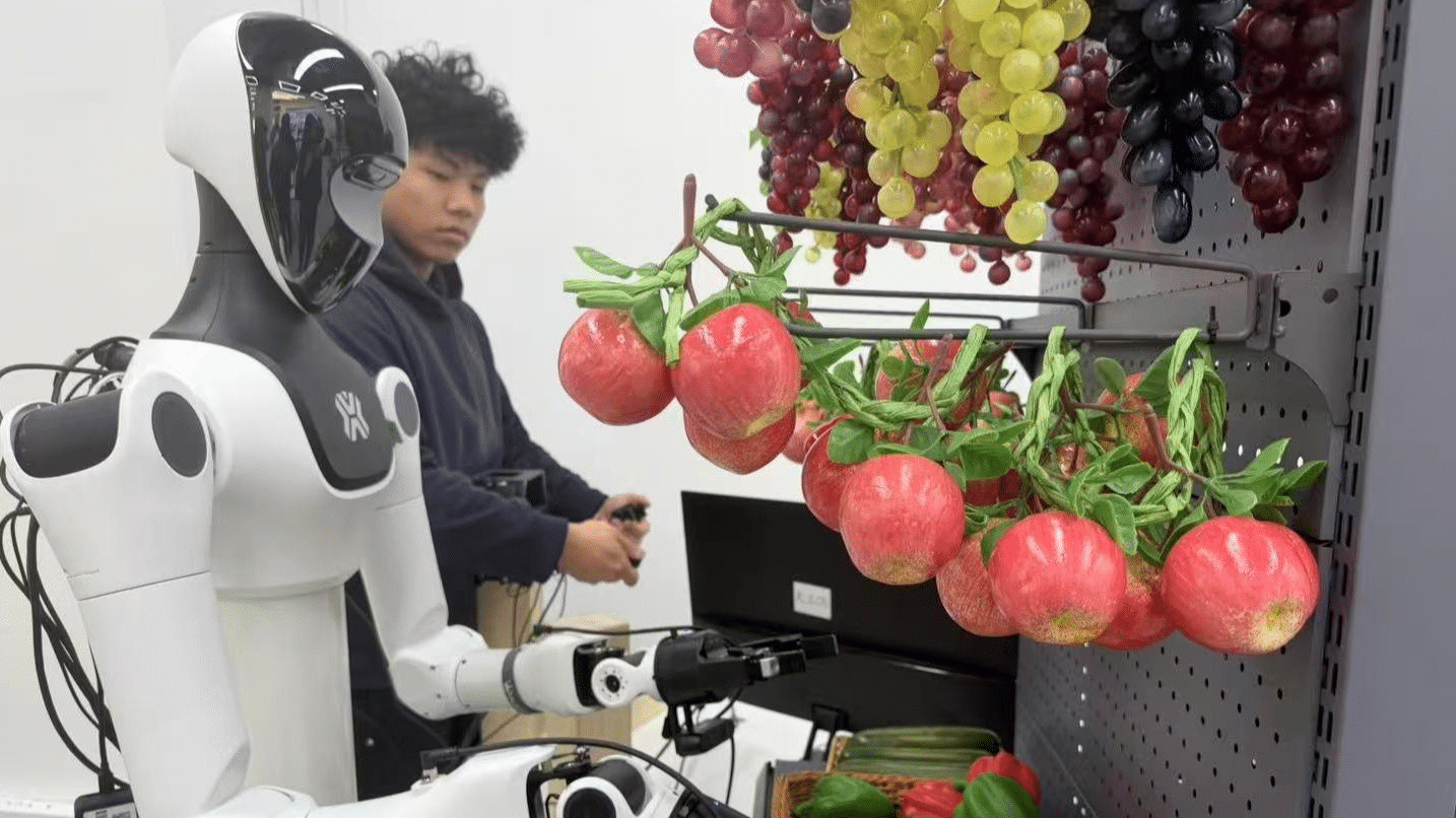 在近5000平方米的數據訓練基地,北京人形機器人創新中心精準復刻了家居、商超、辦公等30餘個場景,讓120余台機器人同步作業,構成國內規模最大、構型最全的訓練矩陣。“天工”機器人系列精準抓取牛油果、分揀果蔬,甚至模擬給嬰兒換尿不濕,在真實物理環境中錘鍊“觸覺與直覺”。