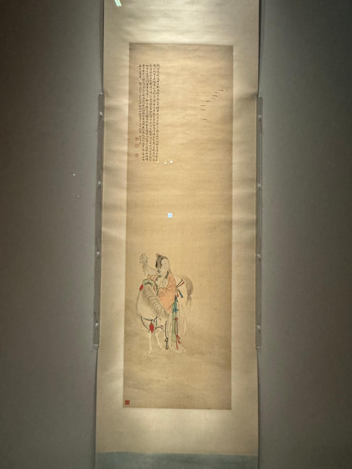 此卷以傳統的仕女畫結合鞍馬畫,繪王昭君懷抱琵琶,斜倚一匹垂首靜立的白色駿馬,目送鴻雁遠去。白馬忠實地陪伴着昭君的孤獨行旅,映襯出昭君身負民族使命的堅韌以及遠離故土的惆悵。畫卷的背景疏朗留白,塞外雲氣烘托出遠行的寂寥氛圍。空中的歸雁既有思鄉之意,亦暗合昭君美貌“落雁”之傳說。此作“以柔寫史”,將民族大義的歷史主題融入女性個體的生命瞬間。畫家費丹旭,號曉樓,浙江湖州人,活躍於清代道光年間。圖中詩作亦是費丹旭所寫。