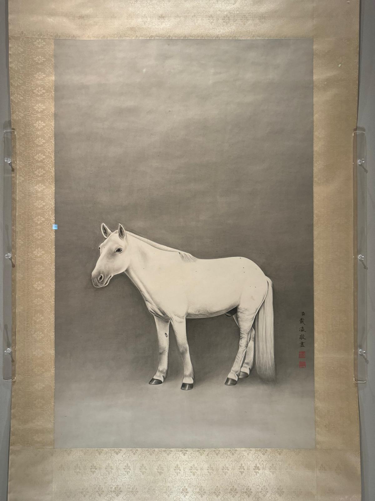 愛新覺羅·載瀛為道光帝(1821-1850年在位)之孫,此畫是首次在北京故宮以外展出。載瀛擅長畫馬,他汲取歷代名家及郎世寧等人的馬畫之長,是愛新覺羅家族鞍馬畫的代表人物。此作以墨筆繪一匹白色駿馬獨自屹立,背景空無一物,純以淡墨暈染,烘托出白馬毛色的細膩,品性的高潔。載瀛以工細的中國畫筆墨結合歐洲繪畫的解剖知識與素描意趣,將明暗對比弱化為平面光源。