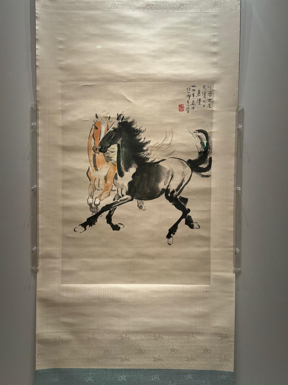 正值抗日戰爭勝利之際,徐悲鴻創作大量駿馬圖鼓舞士氣。此作是1945年春徐悲鴻贈予“比德世兄”與“天瓊女士”的新婚賀禮。畫中一黑一橙兩匹駿馬並頭齊驅、身姿颯爽、鬃毛飛揚,於親密間亦流露出蓬勃生機。畫家以濃淡不同的墨筆精準地捕捉了馬匹的動勢和解剖結構,展現出其創作晚期融匯中西、技藝純熟的藝術面貌。