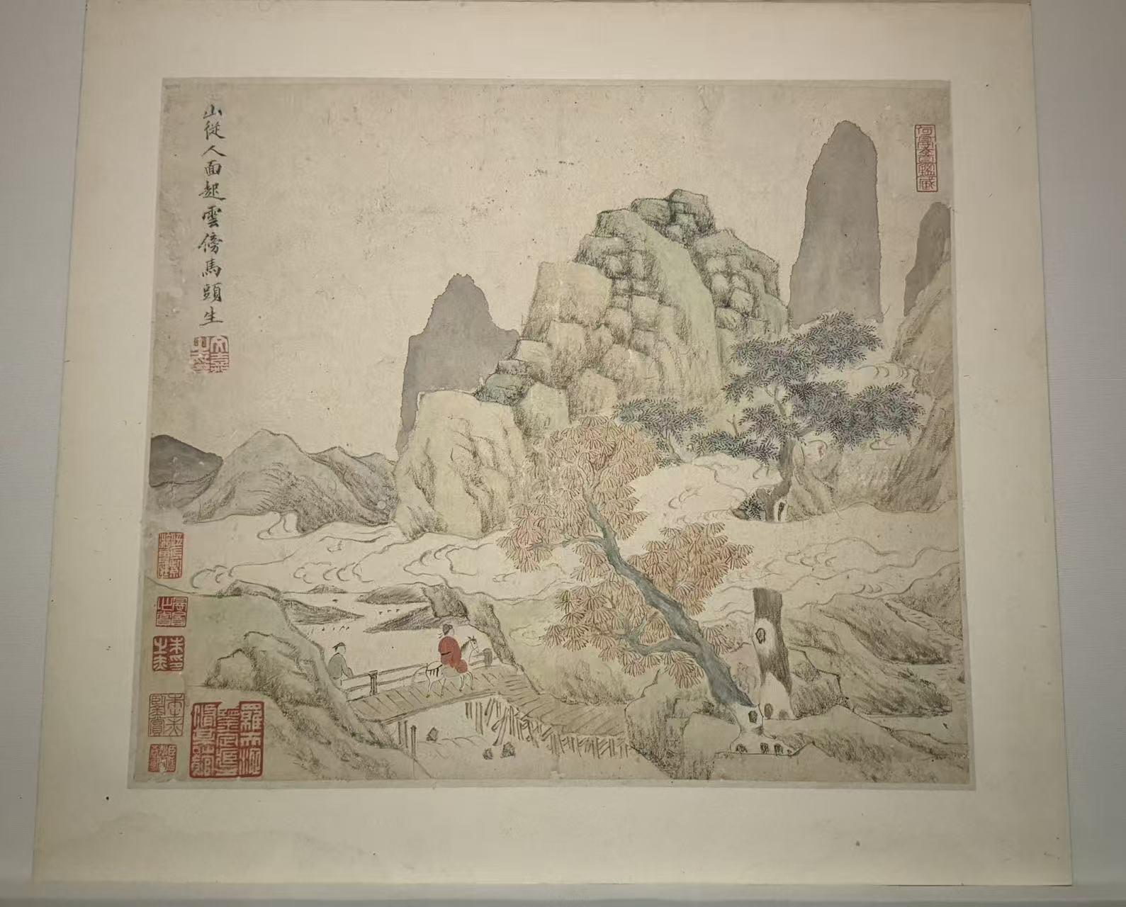 文嘉,字休承,活躍於明代中期(約16世紀)蘇州地區,為“吳門四家”中文徵明(1470-1559年)之次子。此作為典型的詩意畫:畫中一文人着紅衣、騎白馬,緩行於溪橋之上,身後有一侍從跟隨,畫中四周雲霧繚繞,呼應畫家所題唐代詩人李白(701-762年)的名句:“山從人面起,雲傍馬頭生”。畫家將人物與馬匹置於深秀的山水背景中,營造出空靈幽遠的意境。作品筆墨松秀、設色清雅,承襲了文徵明溫潤典雅的藝術特色。