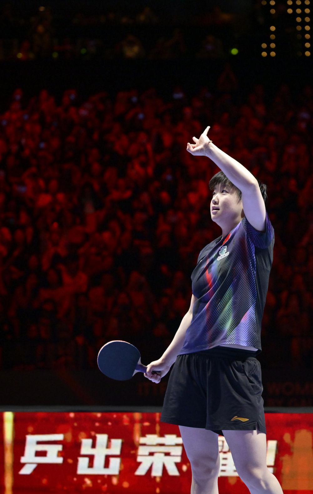 女單決賽率先上演“巔峰對決”,世界排名前兩位的國乒隊員孫穎莎與王曼昱在決賽相遇。首局比分戰至9平後,孫穎莎以11:9率先兌現局點。第二局,孫穎莎8:2領先後被連追4分,暫停後以11:8再下一局。第三局打到11平後,孫穎莎以13:11取勝。第四局王曼昱奮起直追以11:8扳回一城。第五局,孫穎莎保持迅猛攻勢,11:7鎖定勝利。奪冠瞬間,她高舉手臂,比出“三”的手勢。