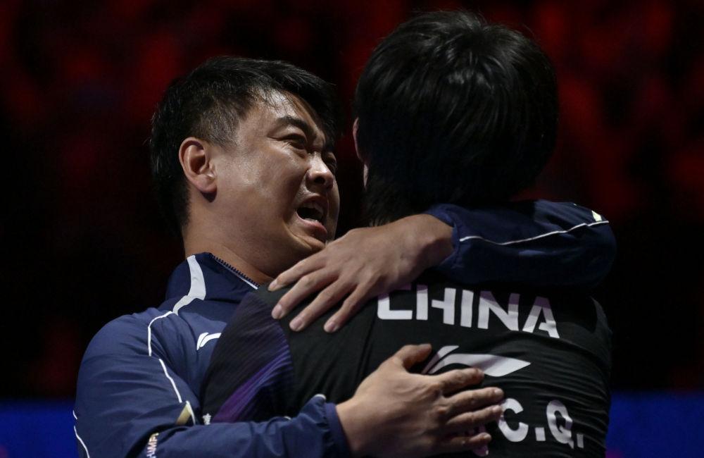 奪冠後,王楚欽躺倒在地,起身後擁抱了教練,並指了指背後球衣上的“CHINA(中國)”。