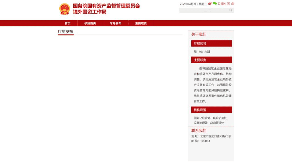 據國務院國資委消息,國務院國資委新設境外國資工作局。據官網介紹,境外國資工作局主要職責為指導所監管企業國際化經營和境外資產布局優化、結構調整,承擔所監管企業境外資產監督有關工作,加強境外投資經營等方面風險防範化解,承擔境外突發事件和危機處理有關工作。