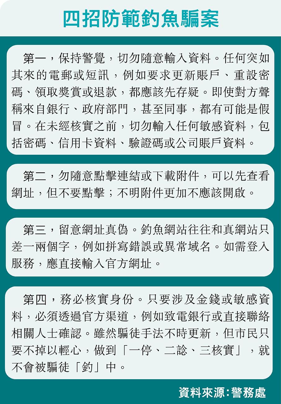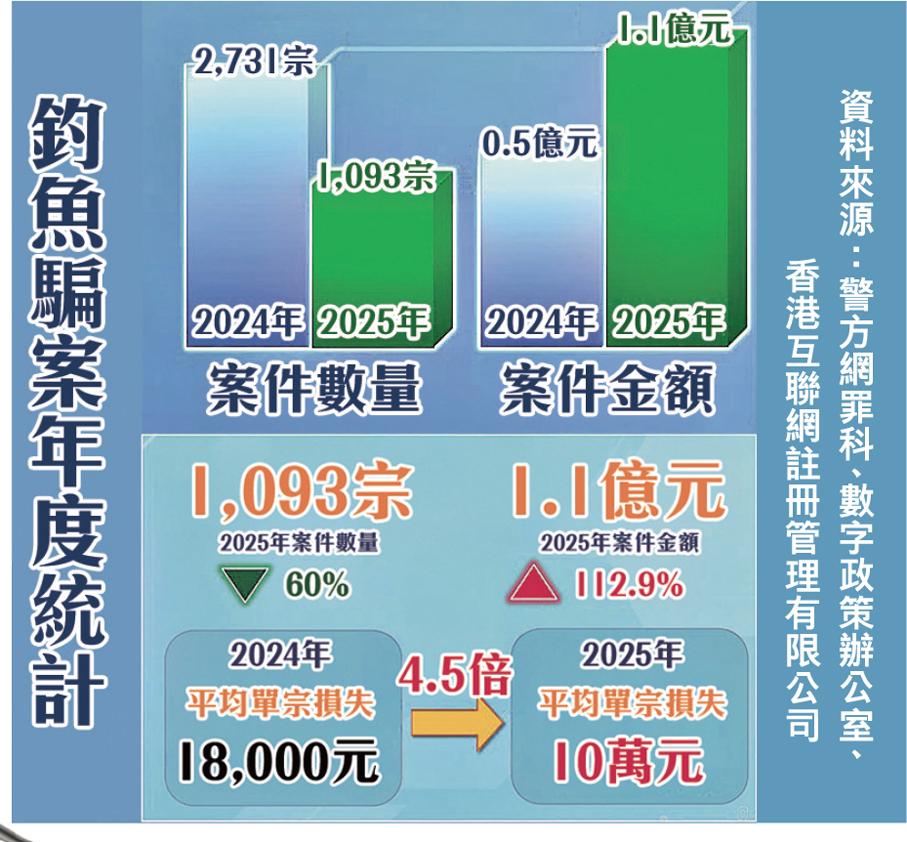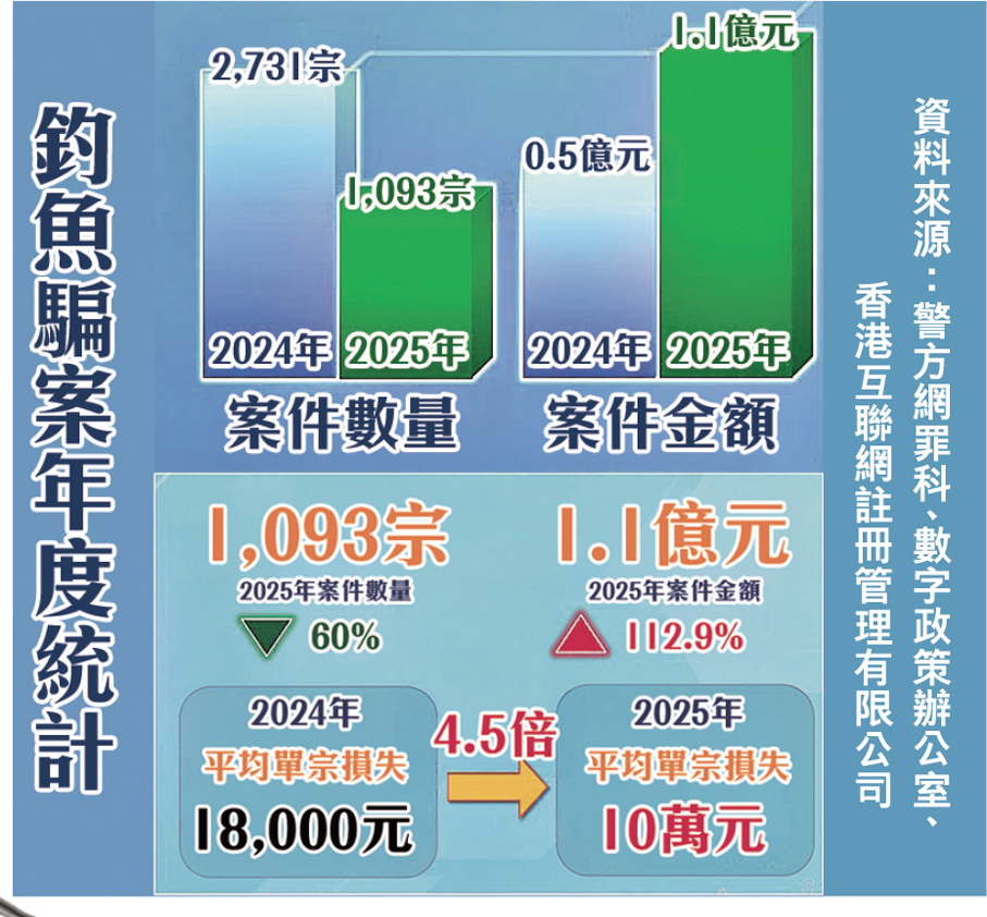 香港“釣魚”騙案報案從前年的2,731宗,下跌至去年的1,093宗,但損失金額則由前年約5,000萬元,上升至去年的1.1億元。騙徒會設計“釣魚”連結引導受害人在假網站輸入證券戶口、網上銀行或信用卡登入資料以盜取更多款項,市民一旦登入“釣魚”連結便會“輸身家”。