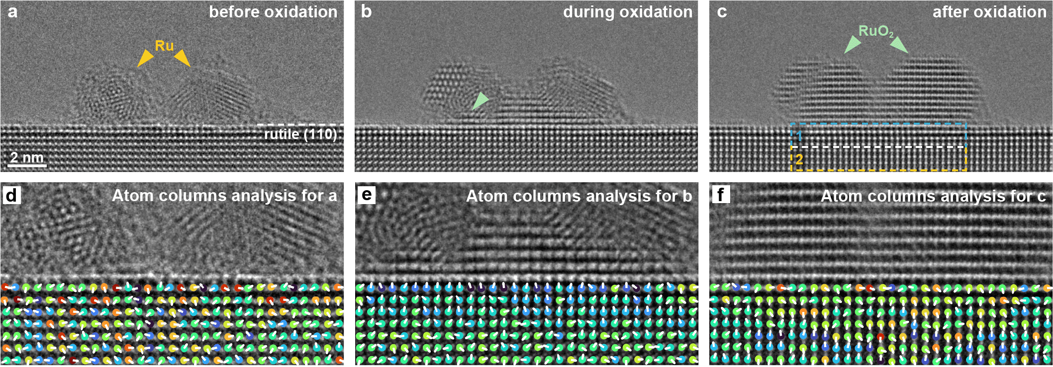 本工作中,研究團隊聚焦於高性能負載型Ru(釕)基催化劑的研發,利用原子分辨環境透射電鏡,從原子尺度原位解析了金紅石型二氧化鈦中Ru單顆粒的氧化機制,並首次在該過程中觀測到體相氧溢流,證實了載體中的晶格氧以空位介導的方式通過界面輸運至金屬顆粒。
