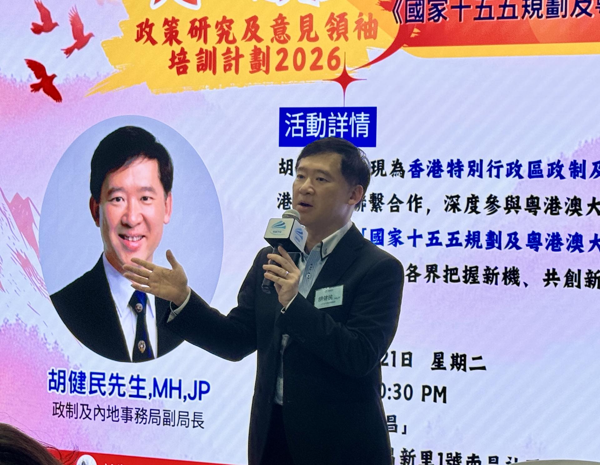 紫荊雜誌(記者 劉可熠) 4月21日香港報道:由明匯智庫主辦、香港廣東青年總會及紫荊研究院等機構支持的“明日新星”政策研究及意見領袖培訓計劃2026政策分享課,今晚(21日)在南昌社區中心舉行。政制及內地事務局副局長胡健民應邀擔任主講,圍繞“國家十五五規劃及粵港澳大灣區機遇”作深入解讀。胡健民強調,香港應跳出與內地城市比低價的思維,以“宜粗不宜細”原則參與規劃編制,重點在金融、創科、北部都會區、大灣區合作等六大範疇发力。