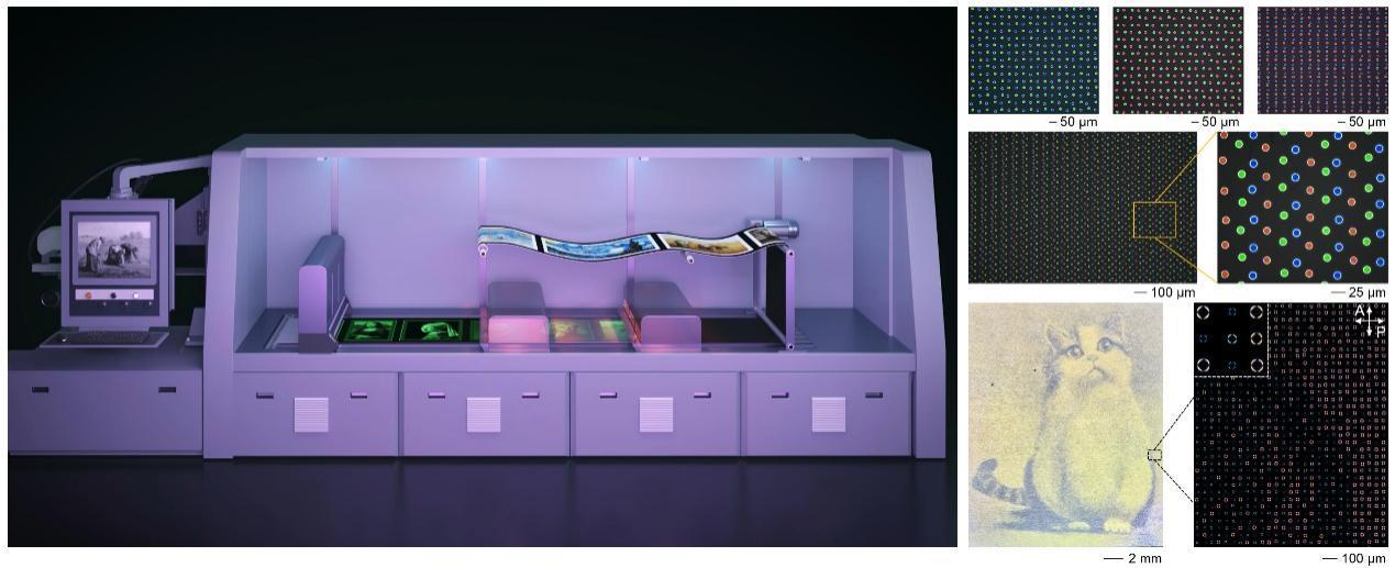 此次,科研人員設計了一種由納米晶格堆疊而成的微米半球單元,通過調整晶格排列,就能讓單個像素點變幻出不同顏色。更關鍵的是,他們自主研發的卷對卷增材打印設備,能用低成本的聚合物材料,通過柔性基材滾筒輸送、連續打印成型工藝,在納米精度下快速製備跨尺度光學超材料,還能為每個像素單獨定製光學性能,一舉解決低成本、規模化、個性化量產難以兼顧的世界性難題。