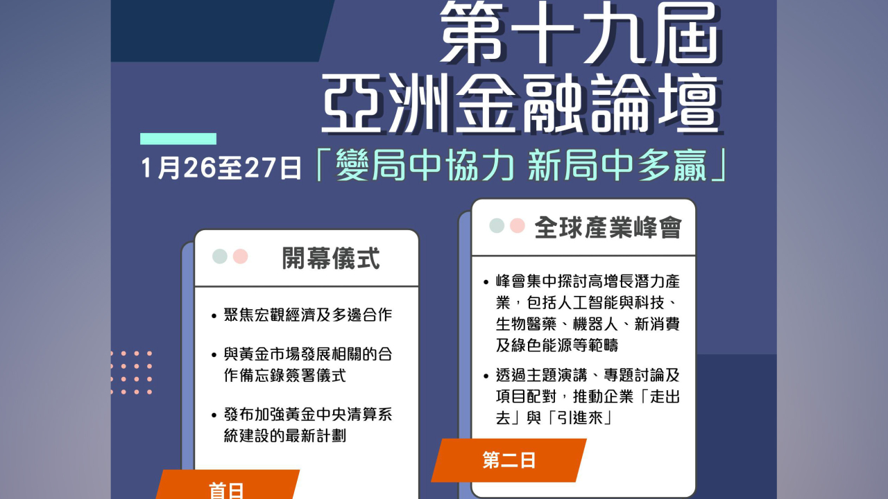許正宇說,論壇首日將舉行開幕儀式,聚焦宏觀經濟形勢及多邊合作,並設有與黃金市場發展相關的合作備忘錄簽署儀式。這是推進香港黃金市場發展的重要一步,屆時將發布加強黃金中央清算系統建設的最新計劃,為未來與內地市場互聯互通做好準備。
