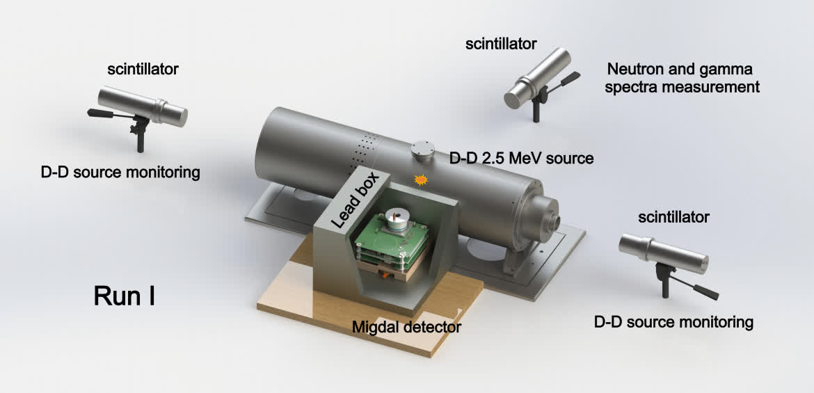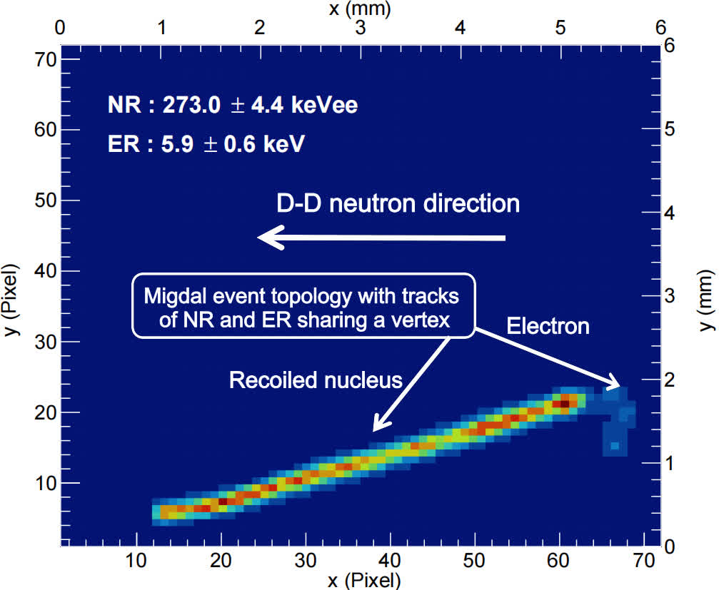 本研究團隊自主研發了“微結構氣體探測器+像素讀出芯片”組合的超靈敏探測裝置,相當於可拍攝“單原子運動中釋放電子過程”的“照相機”。利用緊湊型氘-氘聚變反應加速器中子源,轟擊“照相機”內的氣體分子,會同時產生原子核反衝與米格達爾電子,二者形成“共頂點”的獨特軌跡。通過分析這一特徵,團隊成功地將這種“Migdal事件”從伽馬射線、宇宙射線等背景干擾中區分開來。首次直接證實了1939年利用量子力學預言的Migdal效應。