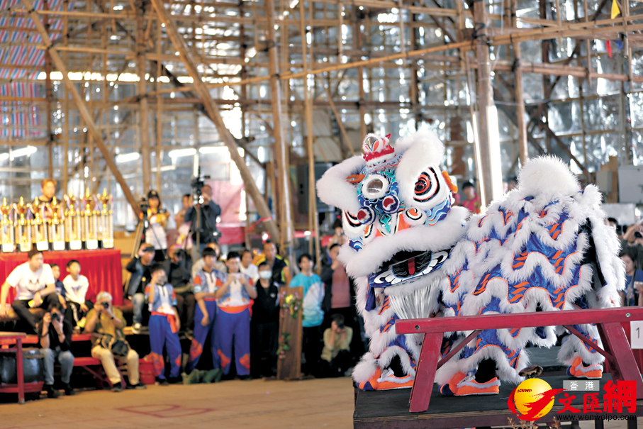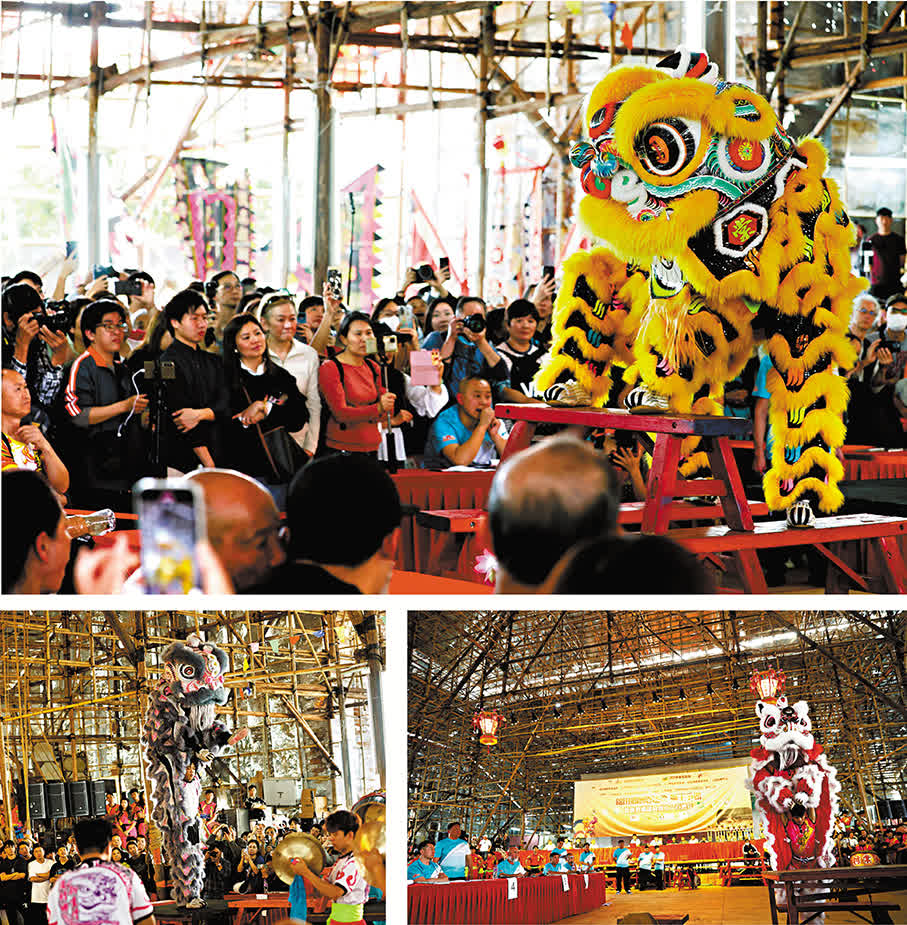 “錦田鄉十年一屆酬恩演戲暨美食嘉年華”首天重頭戲、“獅王爭霸賽”昨日火熱上演,由竹棚搭建而成的“全球最大臨時竹構祭壇”,昨日由大型醮棚搖身變為戲棚,不僅延續了酬神謝恩的傳統氛圍,更化身為競技舞台,迎來28支來自粵港澳三地,以及馬來西亞的精英醒獅隊伍同場較技,吸引數以千計市民湧入棚內觀戰,喝彩聲與掌聲不絕於耳,場面沸騰,最終由八鄉雷公田村榮獲全場總冠。比賽昨日在緊湊的節奏中進行,每支隊伍的表演時間限定於6分鐘至9分鐘內,呈現一套融合了醒獅神態與敘事情節的表演,即除充分展示醒獅神態外,每支隊伍也需要通過故事展現表演,例如模擬老虎攔山擋路,獅子需要奮力驅除,並將故事結合當地文化特色,通過表演呈現給現場觀眾。此外,傳統的枱凳等道具,也在巧思之下化身為故事中的橋樑和高山,生動演繹上山、過海等情節。