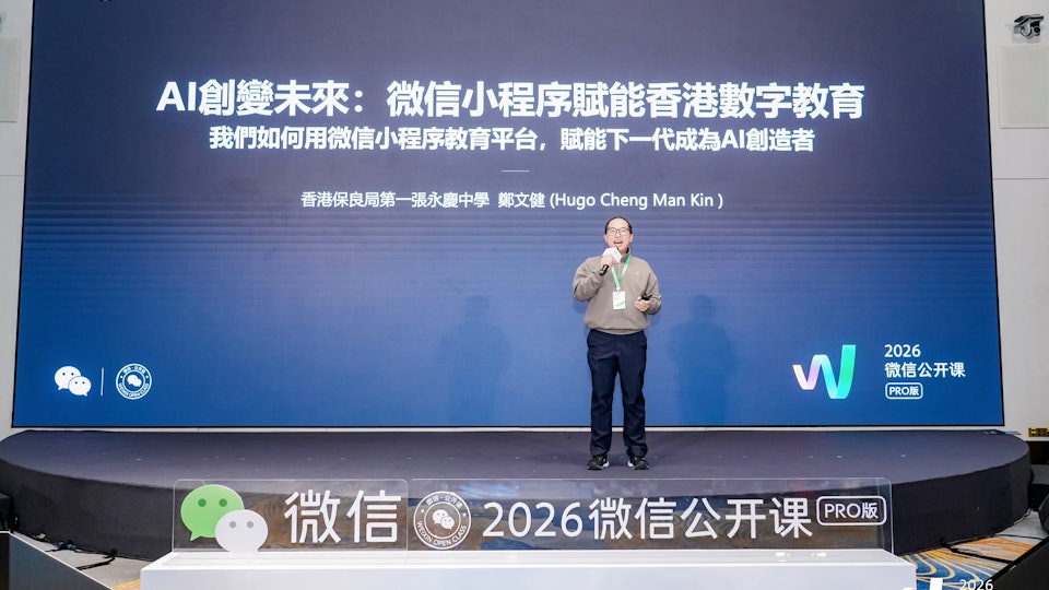 1月15日於廣州廣交會展館舉行的年度科技盛會「2026微信公開課PRO」上,來自香港保良局第一張永慶中學的鄭文健老師,作為教育專場的特邀演講嘉賓,向全國的教育夥伴分享了香港利用微信小程序教育平台教授人工智能(AI)的實踐經驗,並同場發布了首套結合AI與微信小程序開發的實體教材——《AI人工智能賦能:微信小程序開發實戰》。